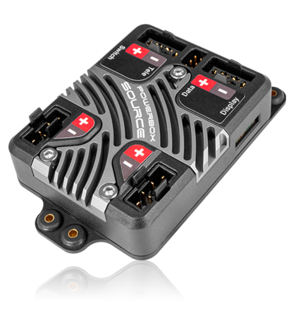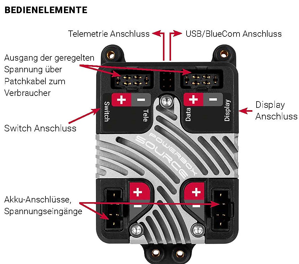Auch ohne Display ist die PowerBox Source im vollen Funktionsumfang nutzbar: der Data Anschluss erlaubt alle Einstellungen entweder mit dem Smartphone und dem BlueCom Adapter oder unserem USB-Interface mit dem Laptop oder PC.