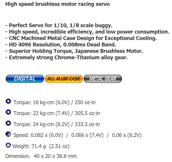 24kg, 0,06s - Brushless Titanium Gear High Speed Digital Servo, Perfect Servo for 1/10, 1/8 scale buggy. High speed, incredible efficiency, and low power consumption.